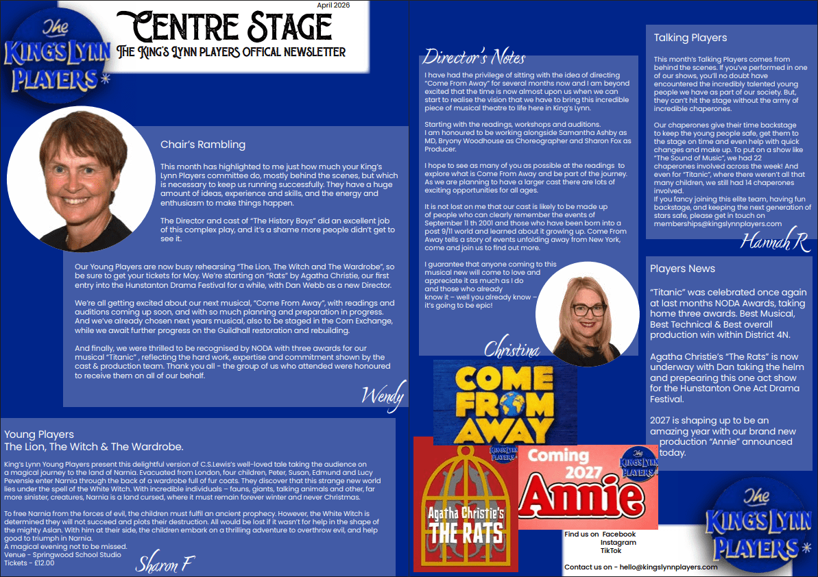 For more details about joining the Kingās Lynn Young Players, please contact our Membership Secretary via the Contact Form at the bottom of the page.